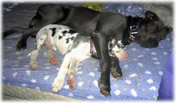 | The Dane is very much a "house pet". They do not like to be left outside for long periods of time. They thrive in a close loving family, and if you raise him with love and care, train him with patience, and socialize him well you will be proud to have him as a part of your family. |